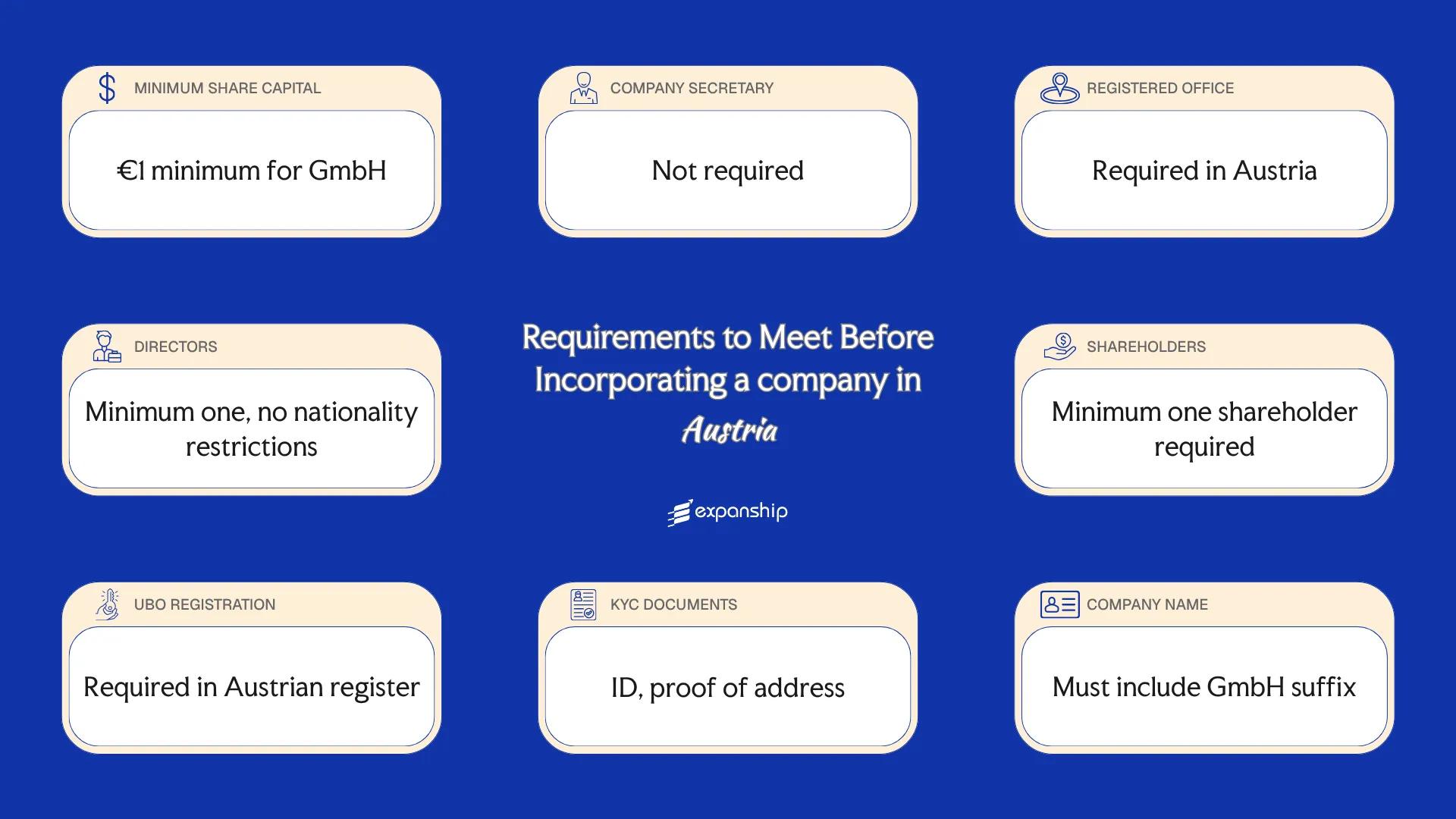 Shareholder requirements in Austria impose no nationality or residency conditions on individuals holding shares in a GmbH. Foreign nationals and non-residents may hold shares without restriction, and there are no limits on the percentage of foreign ownership.