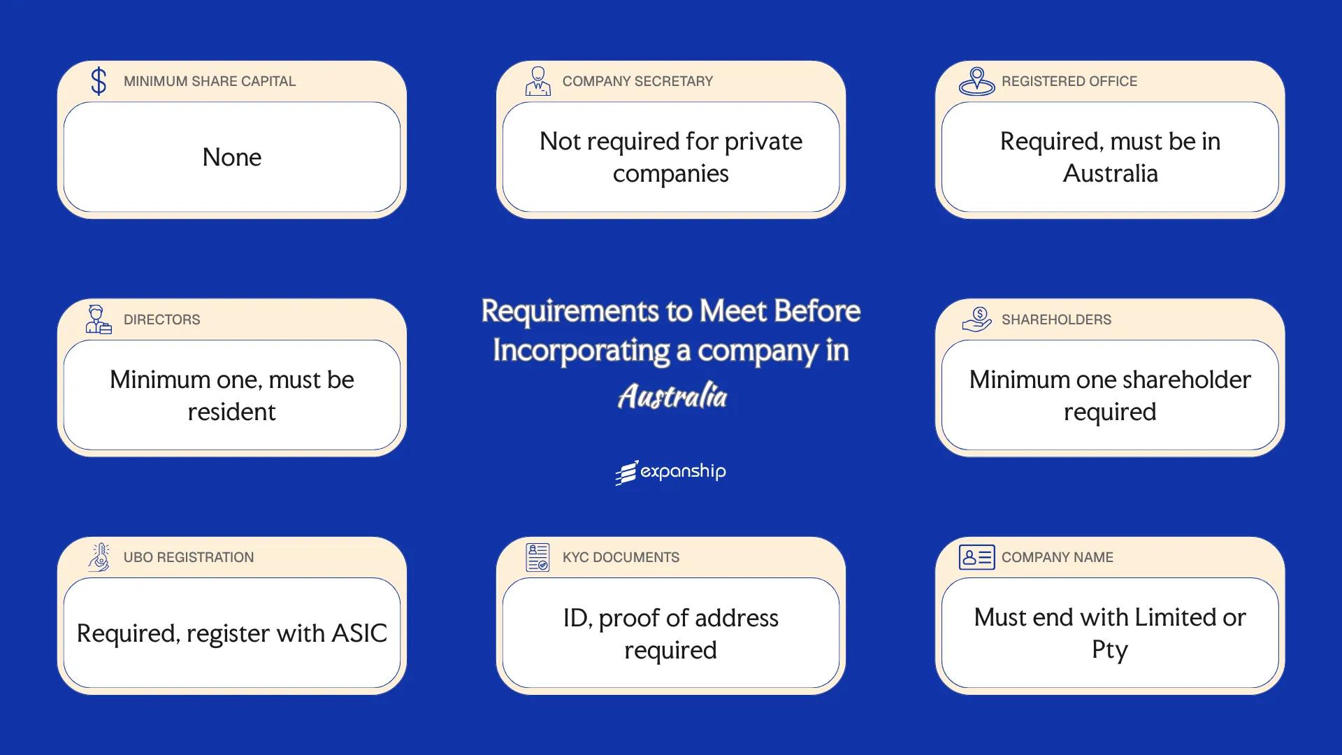 Shareholder requirements in Australia impose no nationality or residency conditions on shareholders of a proprietary limited company. Foreign individuals and entities may hold shares without restriction on ownership percentage.