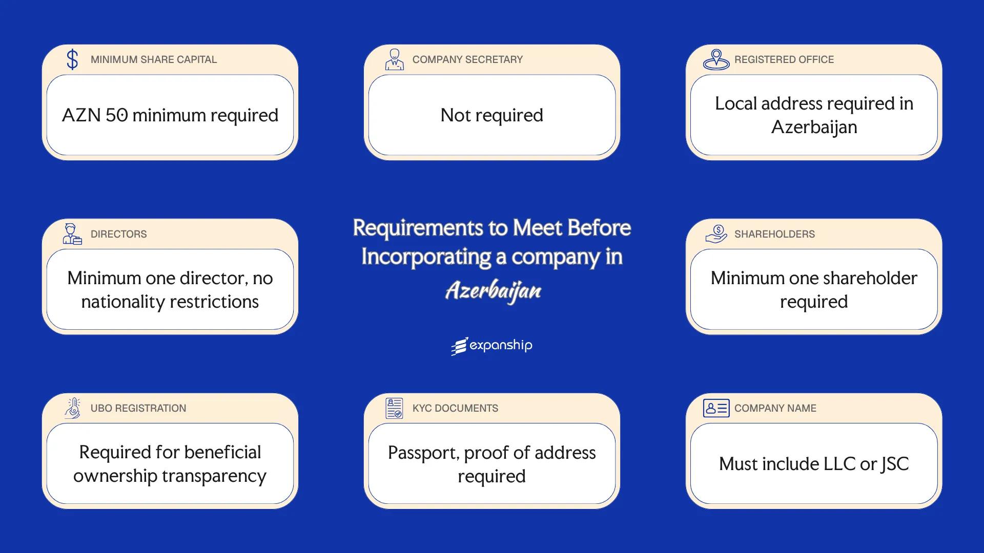 - Corporate entities are prohibited from serving as directors in Azerbaijan, meaning foreign investors must appoint a natural person to fulfil the directorship role at the time of incorporation.