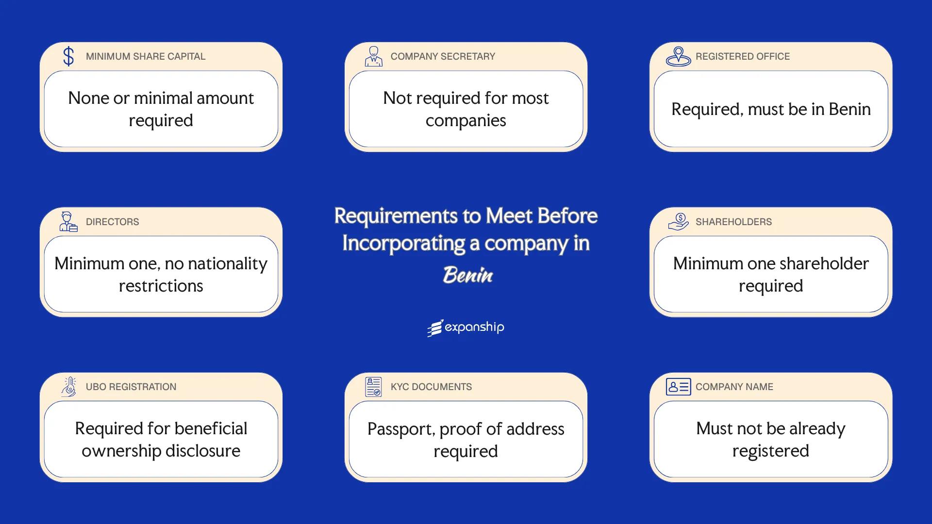 - Beneficial ownership disclosure obligations imposed by applicable national authorities in Benin constitute ongoing compliance requirements that extend beyond the initial incorporation filing.
