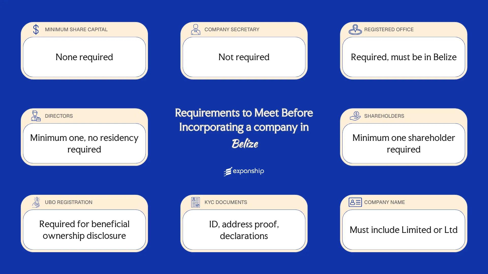 Shareholder requirements in Belize impose no nationality or residency conditions. Foreign nationals and non-residents may hold 100% ownership in a Belize IBC without restriction.