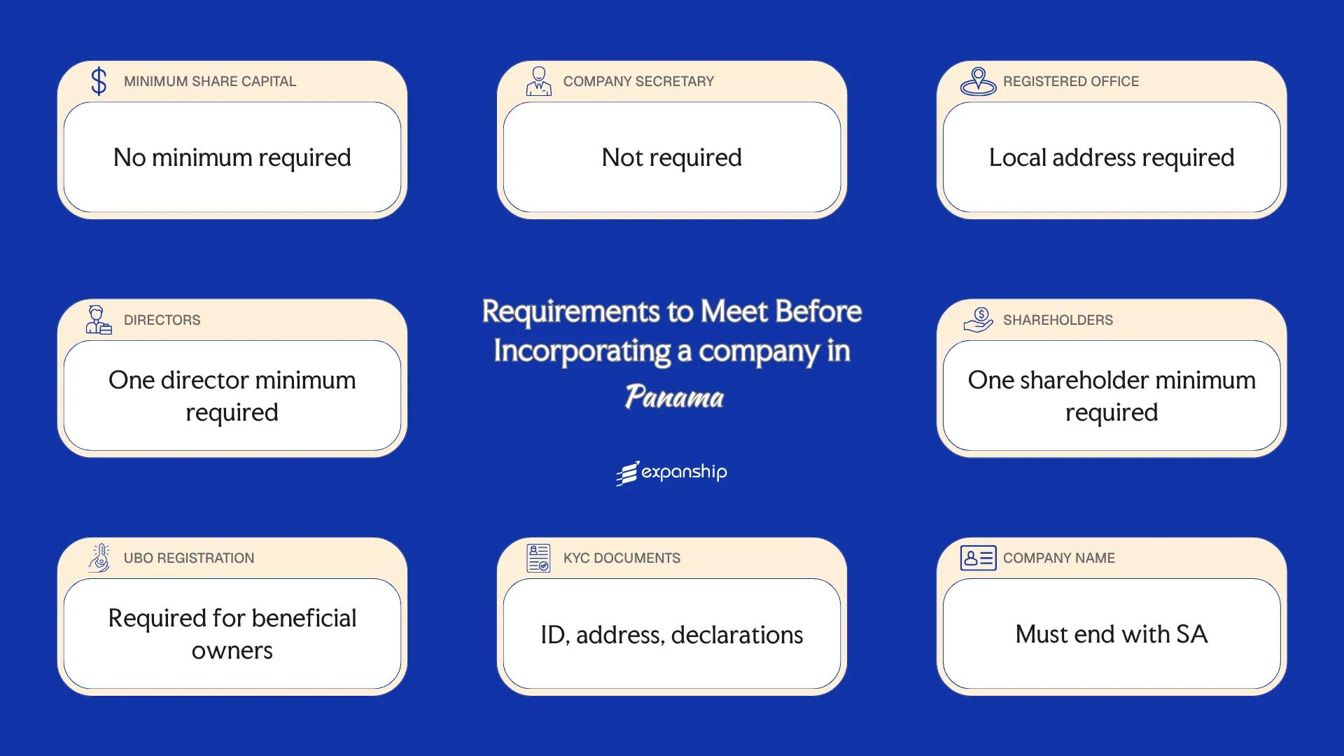 Panama corporation ownership requirements impose no nationality or residency conditions on shareholders. Foreign nationals and non-residents may hold 100% of the shares without restriction.