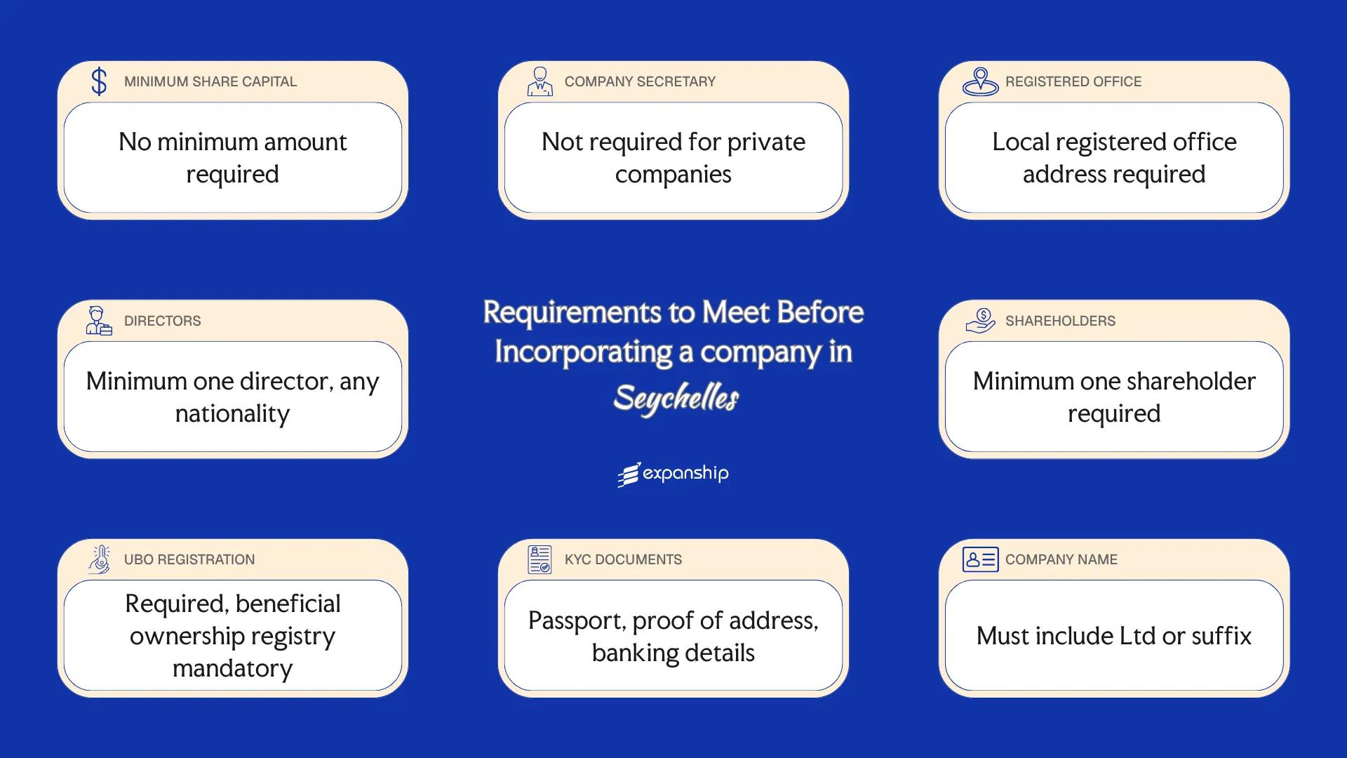 - A physical address within Seychelles is required; P.O. boxes do not qualify as a registered office address.