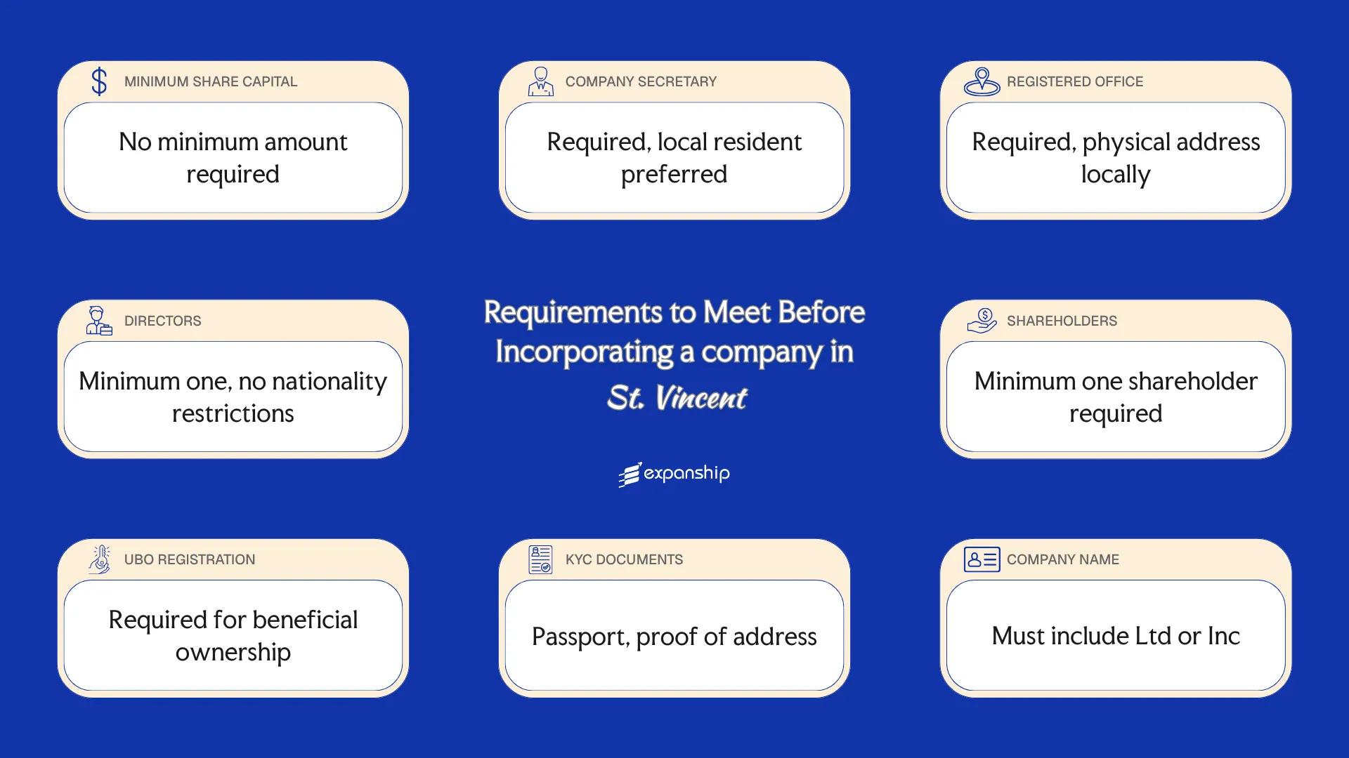 Shareholder requirements in St. Vincent and the Grenadines impose no nationality or residency conditions on shareholders of an IBC. Foreign nationals and non-resident individuals may hold shares without restriction on ownership percentage.